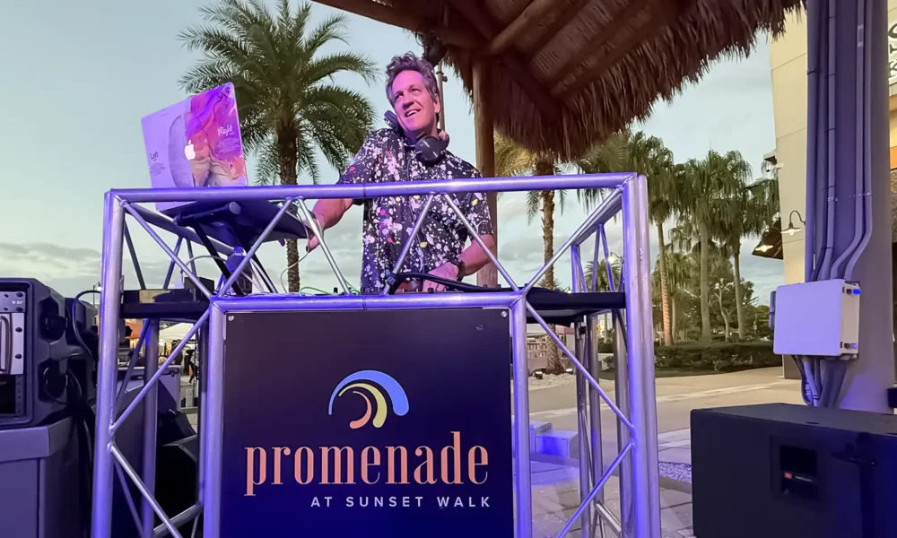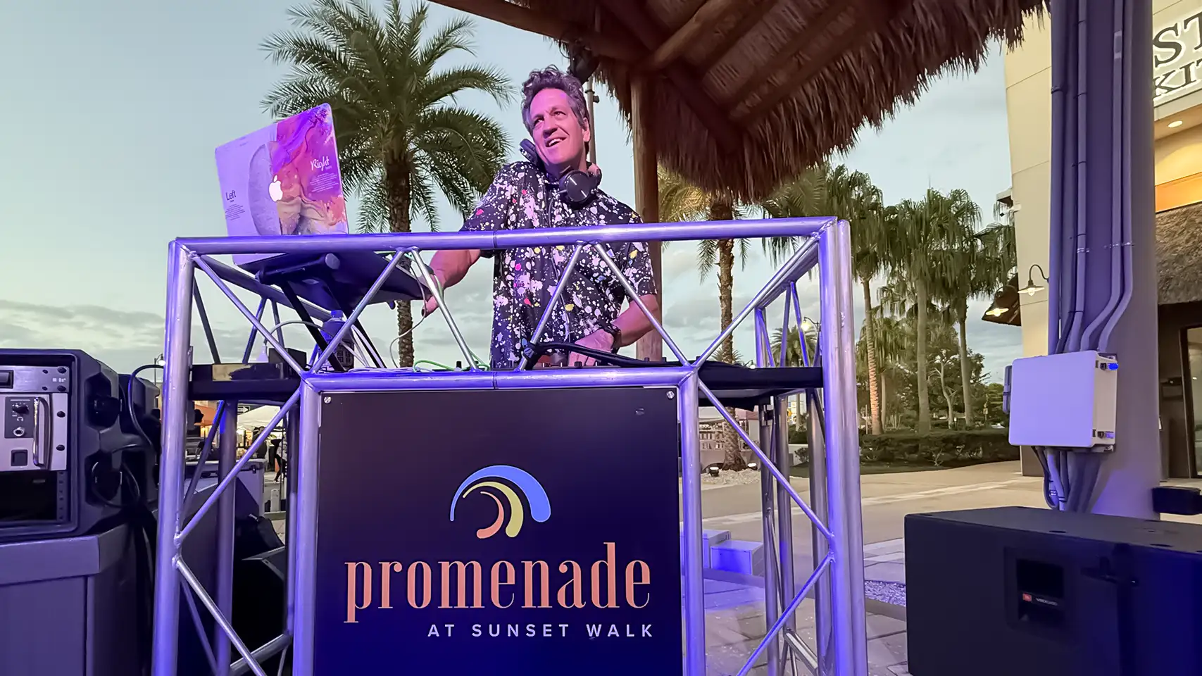 DJ Broz performs live while you sit back, sip, and savor at Salty Rim Bar & Grill at Margaritaville Resort Orlando, next to the Promenade at Sunset Walk.