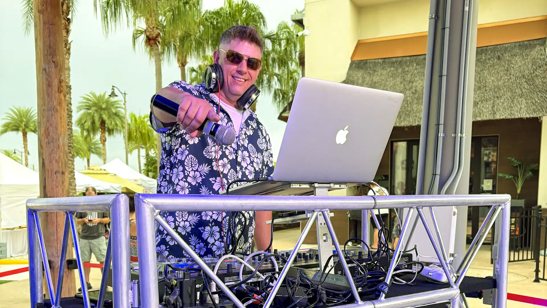DJ Flatline performs live while you sit back, sip, and savor at Salty Rim Bar & Grill at Margaritaville Resort Orlando, next to the Promenade at Sunset Walk.