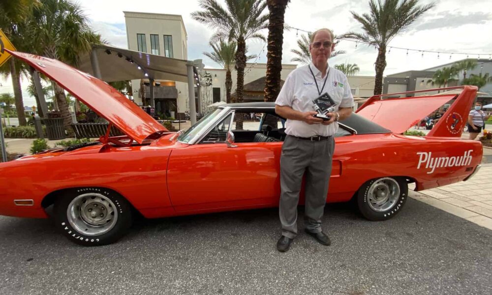 1st place Show Car Saturday Nights winner poses next to his Plymouth classic car.